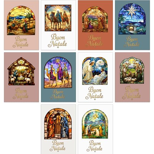 Set completo di 30 biglietti di Natale religiosi che celebrano il vero significato cristiano del Natale. Perfetti per auguri pieni di fede, speranza e luce.,Include 15 diversi design ispirati tutti i vetrate artistiche delle chiese, ognuno presente in due copie. I colori vividi e le linee luminose creano un effetto sacro e suggestivo.,Formato A6 una volta piegati, ideale per scrivere messaggi personali, pensieri spirituali o versetti biblici.,Interno bianco per una personalizzazione completa di ogni biglietto, rendendolo adatto a familiari, amici, parrocchie o comunità religiose.,Con 30 buste bianche di alta qualità, perfettamente abbinate ai biglietti e pronte per essere spedite durante la stagione natalizia.