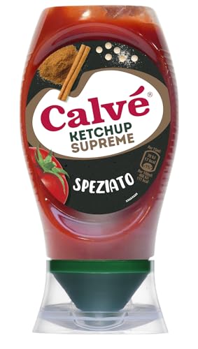 KETCHUP SPEZIATO CALVÉ: ketchup saporito, arricchito da un mix ricercato di spezie e aromi naturali: zenzero, cannella, fieno greco, pepe di cayenna, pepe bianco e chiodo di garofano.,GUSTO UNICO ED ESOTICO: lunico ketchup speziato presente sul mercato, preparati a un viaggio di sapori!,IDEALE CON: carne alla griglia, panini ricchi o piatti vegetariani.,FORMATO TOP DOWN 250ML: disponibile nel comodo formato Top Down 250 ml.,CALVÉ: dai voce alla tua creatività rendendo i tuoi piatti super gustosi. Calvé, perchè buono può diventare buonissimo!